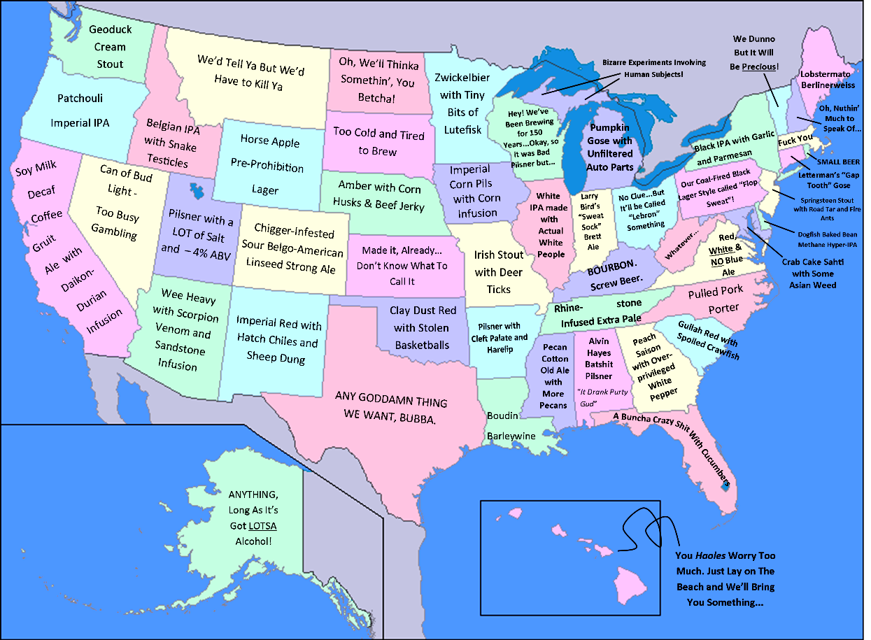 Home I worked hard and thought about this a LOT. So, here is my first-ever National Map of each state’s great new evolving beer styles! (CLICK on map to enlarge.) Share this:Tweet Click to share on delicious.com (Opens in new window) delicious.com Click to print (Opens in new window) Print Click to email a link to a friend (Opens in new window) Email MoreShare on Tumblr Click to share on Reddit (Opens in new window) Reddit PocketLike Loading... Related
