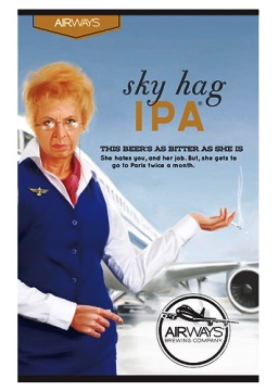 It’s your beer. You made it. If there’s a memory or association that resonates for you, use it. Airways Brewing, in Kent, Washington, is owned by Alex Ditmar, a guy who used to work in the airline industry. Alex will never run out of beer names. Pre-Flight Pilsner, “Sky Hag” (Tag line: photo of a crabby flight attendant: “You think she’s bitter?), “Seat Kicker” and “Loud Lady” IPAs, “PSA” (after TSA) Summer Ale, “Beverage Cart”, “Pat Down”, “Final Departure”, “Starliner”…no shortages anywhere on Alex Ditmar’s horizon. And, too, not everything needs to wear a baggage tag. He also has beers just called Lemon Drop, Northwest Amber, and Raspberry Cream Ale. If no name rings your bells, don’t sweat it. The next one will.