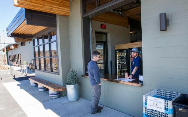 In Bend. Oregon, Crux Fermentation Project’s, handy patio food window is now their curbside pickup./Photo eastoregonian.com