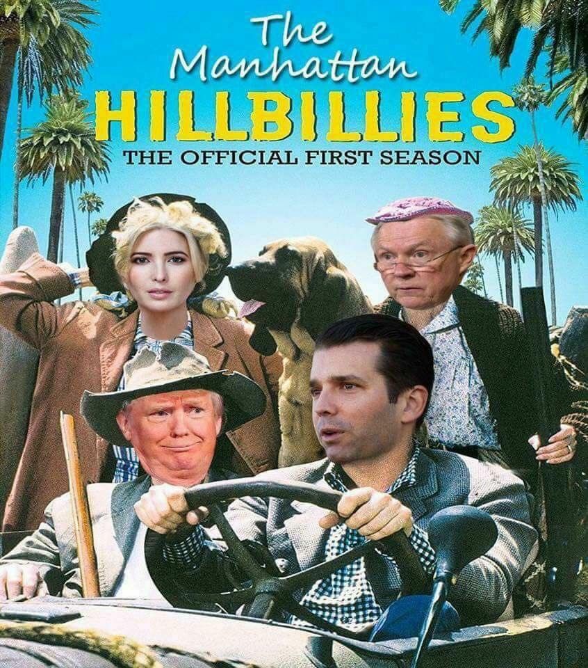 I also know this post was prompted by a FB friend, just this morning. In watching Trump’s family grow, I’ve seen increasingly that the Trumps have become The Beverly Hillbillies, albeit with dumber accents. That is not a casual comparison. Donald as Jed, Don Jr. as Jethro, Ivanka as Ellie May, Eric as…I dunno, Jethro’s idiot brother, Cletus, and a succession of Grannies, most notably Kelly Ann Conway or her male doppleganger, Jeff Sessions, who even looks like a (slightly) younger Granny. All this, of course, minus 100% of the charm and humor and personal appeal of the originals.
