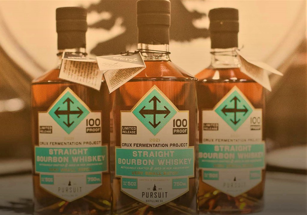 But for their first – and, I would suspect, inevitable – foray into hard liquor, Crux partnered with a distillery rather miraculously located exactly 27.4 miles from my own front door. Armed with this shocking knowledge, the Fabulous Judye and I drove over there – one frigid and gale-force Saturday, three weeks ago – and tasted the 100 Proof Crux Very Small Batch Straight Bourbon Whiskey which was the result of this, well, unlikely collaboration. Nutshell: We wound up taking two bottles of them home, as well as a bottle of Pursuit’s own Blended American Whiskey and two bottles of a (NOT kidding) jaw-dropping Gin that combines all the best aspects of a refined botanical and an even more elegant London Dry. More on this later. This is a Crux post, after all…